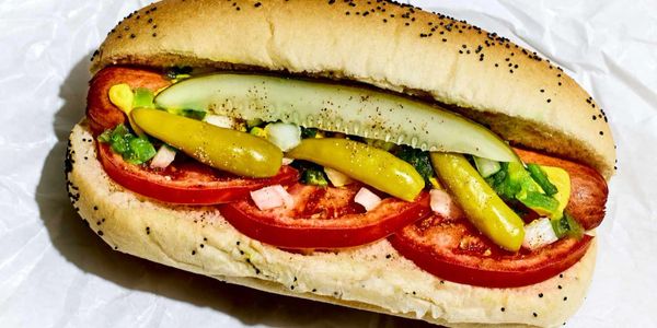 mustard, relish, chopped onions, slice tomatoes, kosher pickle and sport pepper on a steamed poppy seed bun
